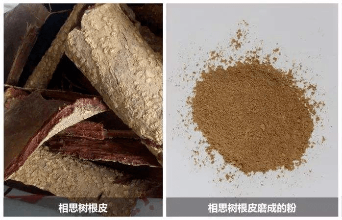 相思树又名台湾树,其根皮内皮呈红褐色,外皮呈灰白色带有白色圆点,干燥粉碎后为褐色粉末。一般将相思树根皮和骆驼蓬子混合,泡水或打粉食用。