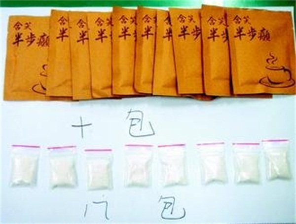 “含笑半步癫”是将K粉及摇头丸混合的粉制成速溶包加入水、饮料、酒类服用的。